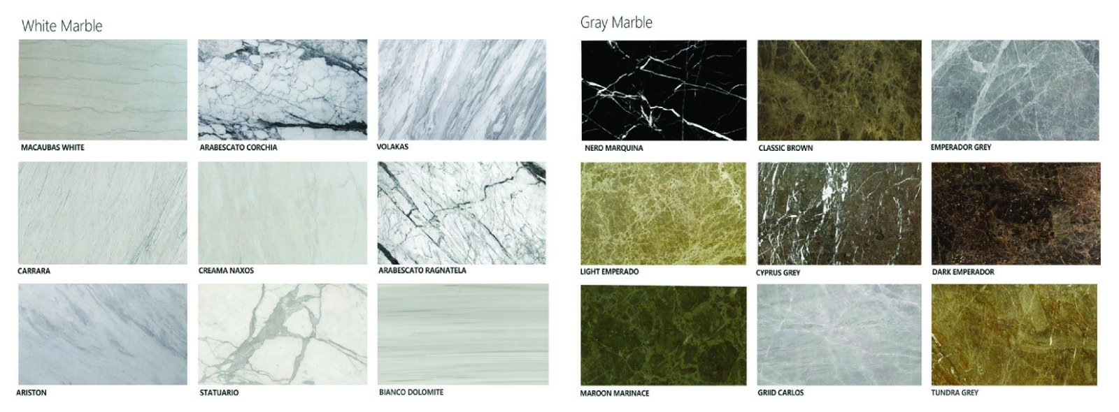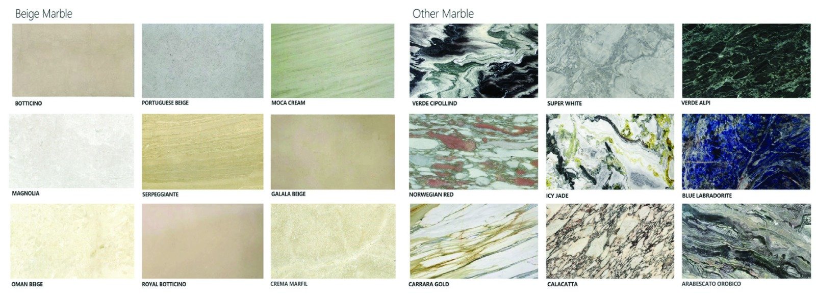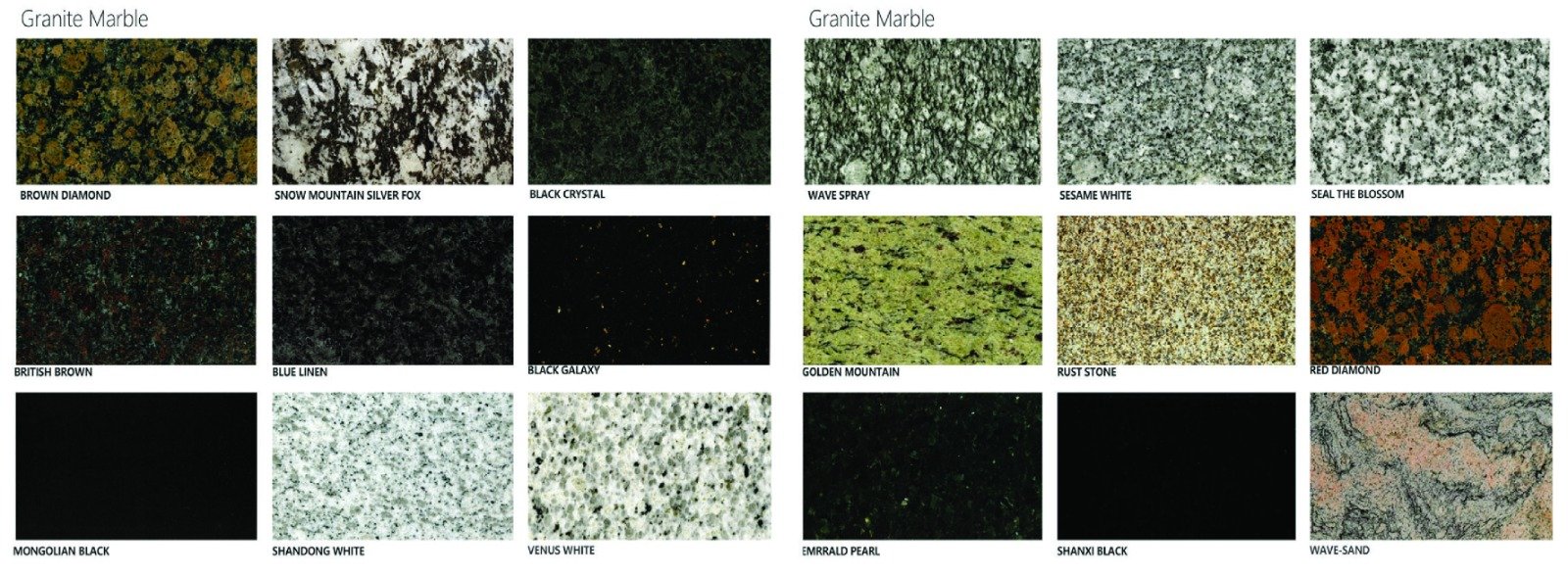 Available slab thicknesses include 15mm, 18mm and 20mm with finishes such as honed and